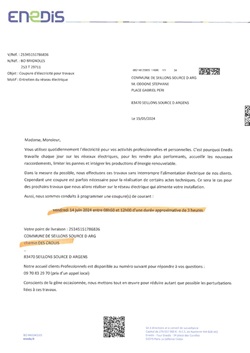 Afin d’améliorer la qualité de la distribution électrique et de répondre aux besoins de notre clientèle, nous sommes conduits à programmer des travaux qui entraîneront une ou plusieurs coupures d’électricité le :