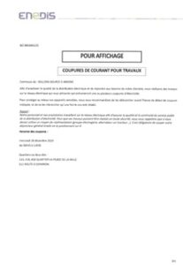 Afin d’améliorer la qualité de la distribution électrique et de répondre aux besoins de notre clientèle, nous sommes conduits à programmer des travaux qui entraîneront une ou plusieurs coupures d’électricité le :