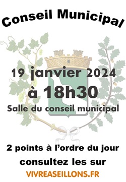 info mairie 19 janvier 2024 : conseil municipal by LeSeillonnais 16jan écrit par LeSeillonnais 16jan 17 La municipalité vous informe de la tenue du conseil municipal qui aura lieu : Le 19 janvier 2024 à 18 H 30 en salle du conseil. Les sujets qui seront abordés, sont : Autorisation d’ester en justice; questions diverses. 83470conseil municipalmairiemairie seillonsmairie seillons sourcesalle du conseil municipalseillonsseillons sourceseillons source d'argensvivre a seillonsvivreaseillons 0 commentaires 0 FacebookTwitterPinterestEmail LeSeillonnais article précédent Voeux 2024 article suivant Association familiale : Journée à Grasse You may also like Var jeunesse : Dispositif d’aide 18mar VICTOIRE ! Le transfert ne se sera plus... 17mar Flash info : Début travaux parking boulangerie et... 15mar 20 mars 2025 : conseil municipal 15mar Arrêté Départemental Temporaire n°2025T0619 14mar Une belle initiative ! 27fév PLANNING DES TRAVAUX DE VOIRIE 27fév Chemin du Jonquier : fermeture temporaire de la... 26fév INFORMATIONS TRAVAUX : Début IMMINENT 23fév Tournée du gynécobus de mars 2025 20fév Leave a Comment Cancel Reply Save my name, email, and website in this browser for the next time I comment. Δ