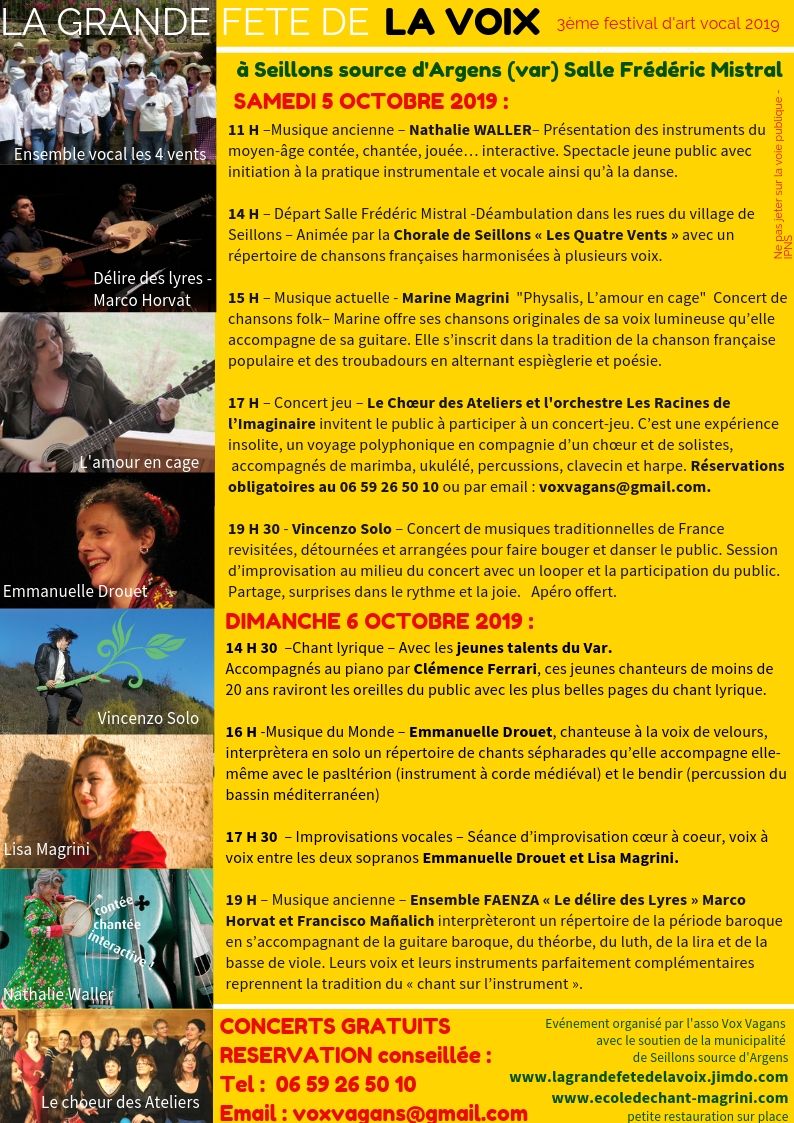 Différents concerts GRATUITS, rencontres et spectacle jeune public sont programmés tout au long de ce week-end à la salle Frédéric Mistral. Cette année, les rues et places de Seillons seront également investies par deux déambulations animée par la chorale de Seillons « les 4 vents ».