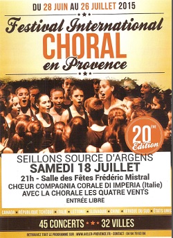 Pour sa 20ème édition, le festival international choral en Provence se produira à Seillons Source d’Argens les 17 et 18 Juillet 2015.