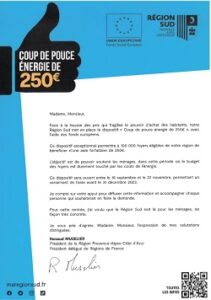 Notre Région Sud et l’Union Européenne mettent en place le dispositif d’aide « Coup de pouce énergie de 250€ ».
