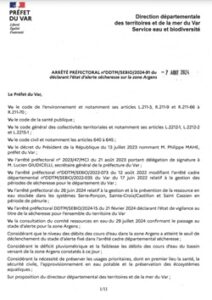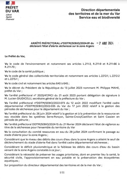 « Au regard de la situation déficitaire pluviométrique et hydrométrique dans le bassin de l’Argens et suite aux retours de la consultation des membres du comité ressources en eau du 29 juillet, le préfet du Var a placé la zone Argens en alerte sécheresse. »