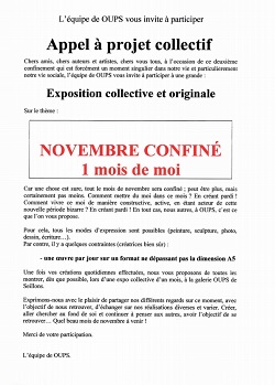 L’association OUPS vous invite à l’occasion de ce deuxième confinement à donner libre cours à votre imagination et à participer à une grande exposition collective et originale:
