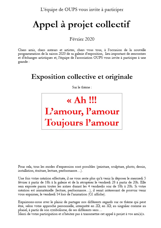 « Chers amis, chers auteurs et artistes, chers vous tous, à l’occasion de la nouvelle programmation de la saison 2020 de sa galerie d’exposition, lieu important de rencontres et d’échanges artistiques. L’équipe de l’association OUPS vous invite à participer à une grande exposition collective et originale sur le thème :