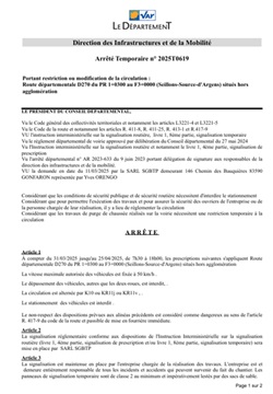 «Pour permettre l’exécution de travaux et assurer la sécurité des ouvriers de la SARL SGBTP sur la route départementale D270 hors agglomération.