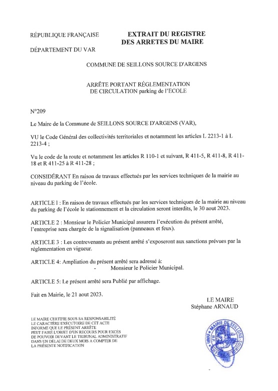 Arrêté communal 2023 : n° 209