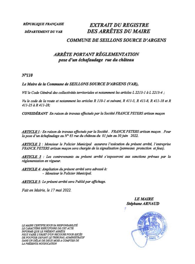 «En raison de travaux effectués par la société FRANCK PETERS (artisan maçon) pour le compte d’un particulier du :