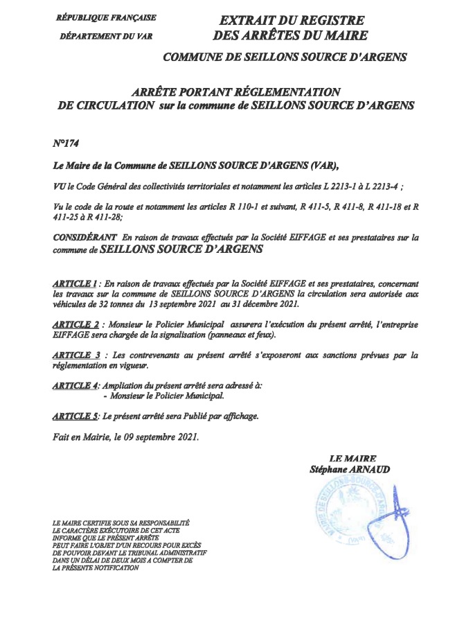 « En raison de travaux effectués par la société « EIFFAGE »et ses prestataires pour des travaux sur la commune de Seillons source d’Argens du :