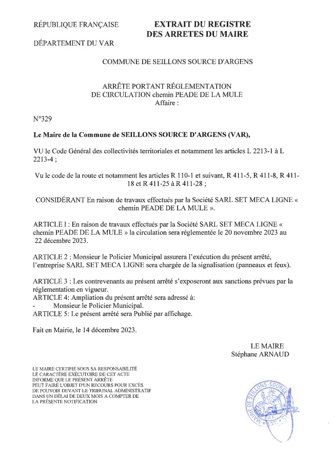 Arrêté n°329 : En raison de travaux effectués par la société SARL SET MECA LIGNE, du :