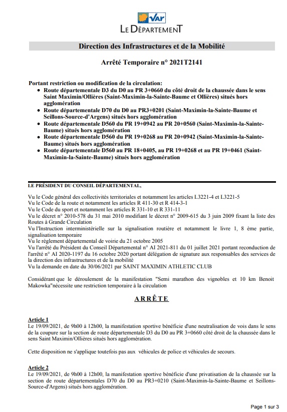 » La manifestation sportive « 10 km et semi des vignobles 2021 » bénéficie d’une privatisation de la chaussée et de priorité de passage le :
