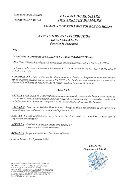 « En raison de l’intervention sur la voie communale pour le compte du CIQ du Jonquier, effectuée par la société EIFFAGE, du :