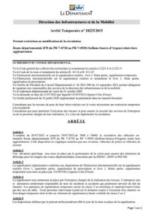 … 28/07/2022 et jusqu’au 29/07/2022, de 7h00 à 18h00, la circulation des véhicules est INTERDITE sur la route Départementale rd 70 en et hors agglomération. Cette disposition ne s’applique toutefois pas aux riverains, véhicules de police et véhicules de secours.