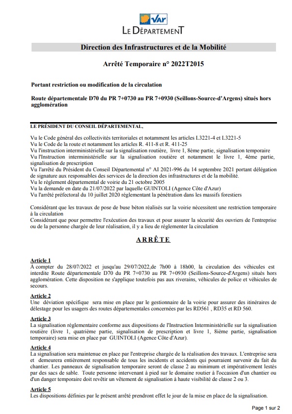 «Pour permettre l’exécution des travaux et pour assurer la sécurité des ouvriers de l’entreprise GUINTOLI (Agence Côte d’Azur)/NGE sur la route départementale RD 70. Considérant que les travaux de pose de buse béton réalisés sur la voirie nécessitent une restriction temporaire