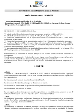 «Pour permettre l’exécution de travaux et assurer la sécurité des ouvriers de l’établissement DOLZA sur la route départementale RD 560 hors agglomération.
