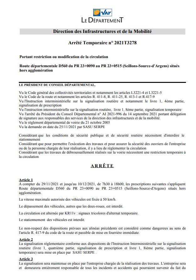 «Pour permettre l’exécution des travaux et pour assurer la sécurité des ouvriers de l’entreprise ou la personne chargée de leur réalisation sur la route départementale RD 560. Considérant que les travaux de débroussaillement réalisés sur la voirie nécessitent une restriction temporaire à la circulation.