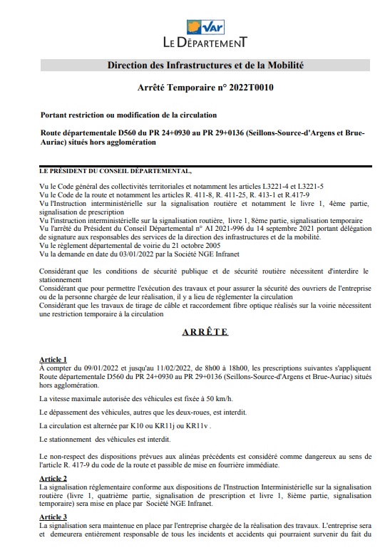 «Pour permettre l’exécution des travaux et pour assurer la sécurité des ouvriers de l’entreprise ou la personne chargée de leur réalisation sur la route départementale RD 560. Considérant que les travaux de tirage de câble et raccordement fibre optique réalisés sur la voirie nécessitent une restriction temporaire à la circulation.
