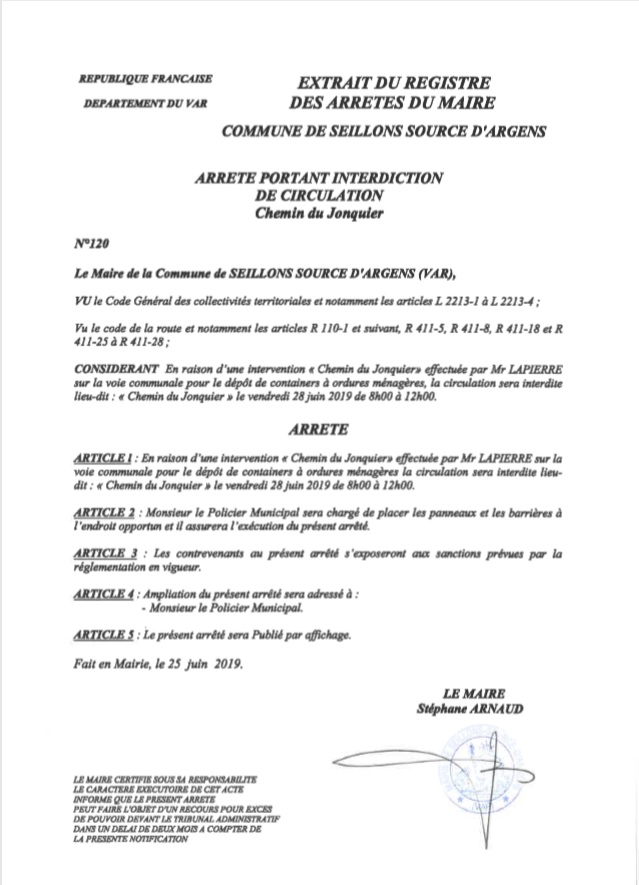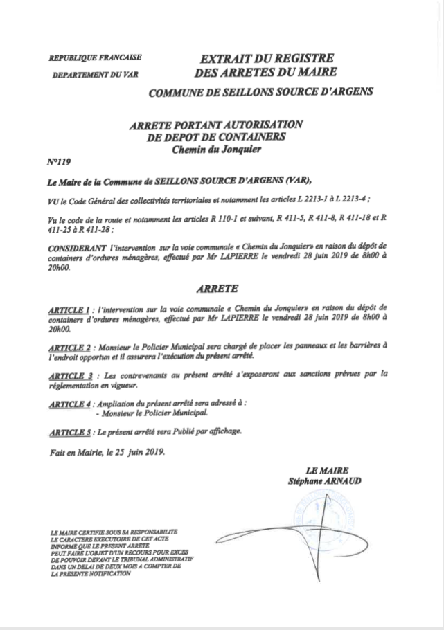 « En raison de l’intervention sur la voie communale pour le dépôt de containers d’ordures ménagères, effectuée par monsieur Lapierre, le :