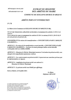 Arrêté n° 179 : La circulation sera interdite esplanade Casadesus et chemin de la Verrerie de 16h00 à 2h00 sauf pour les résidents.