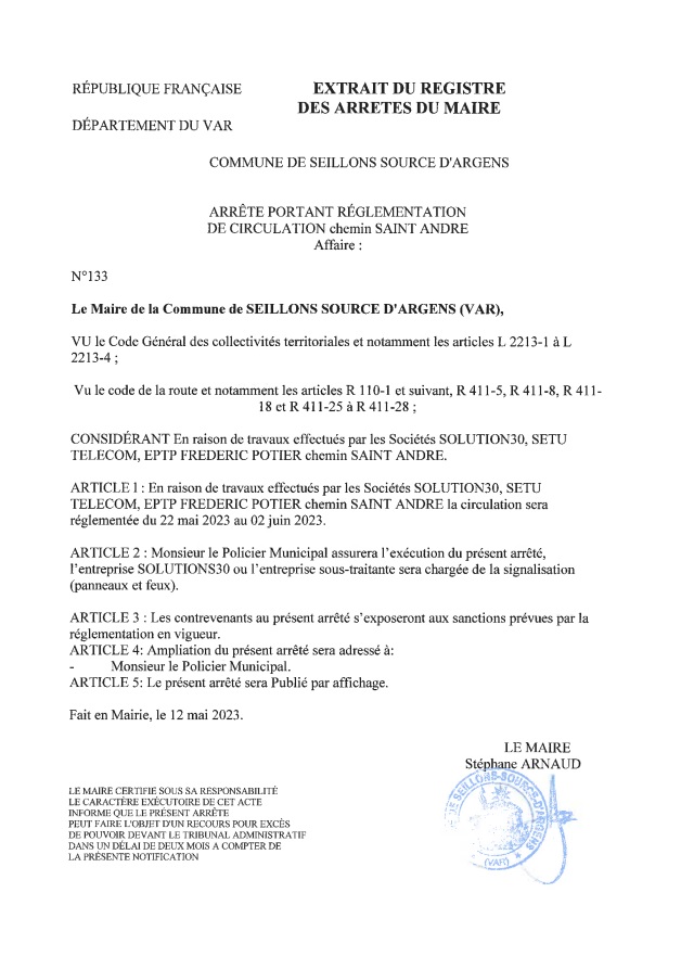 « Arrêté n° 133 : En raison de travaux réalisés par les sociétés Solution30, SETU TELECOM et EPT Frédéric Potier du :