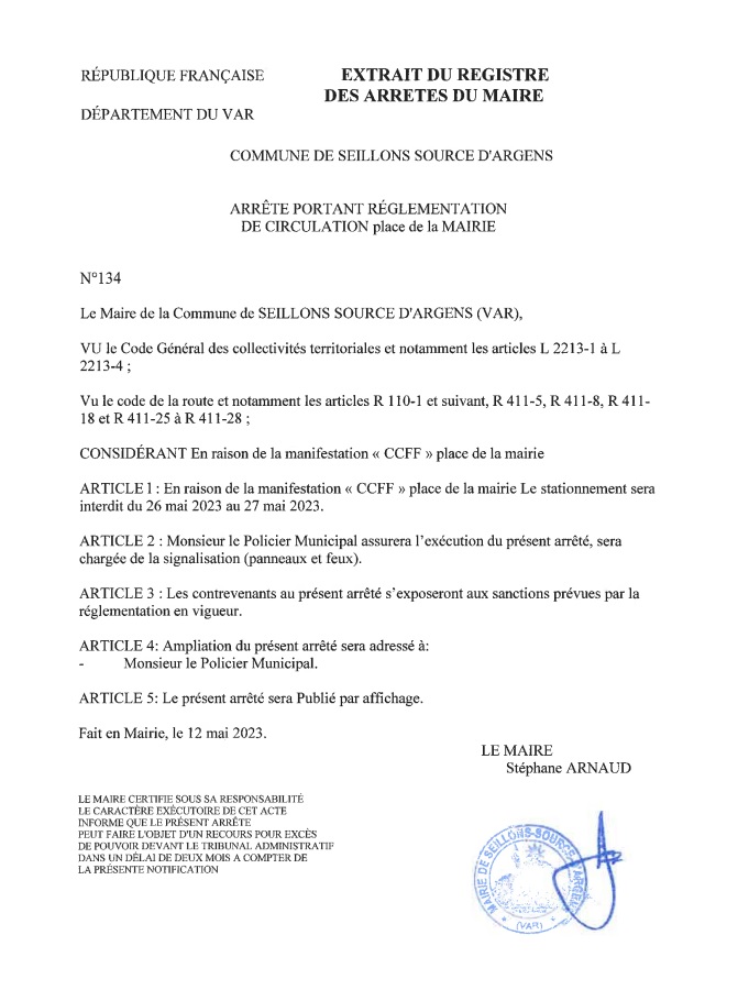 Arrêté n° 134 : En raison d’une manifestation organisée par le CCFF, du
