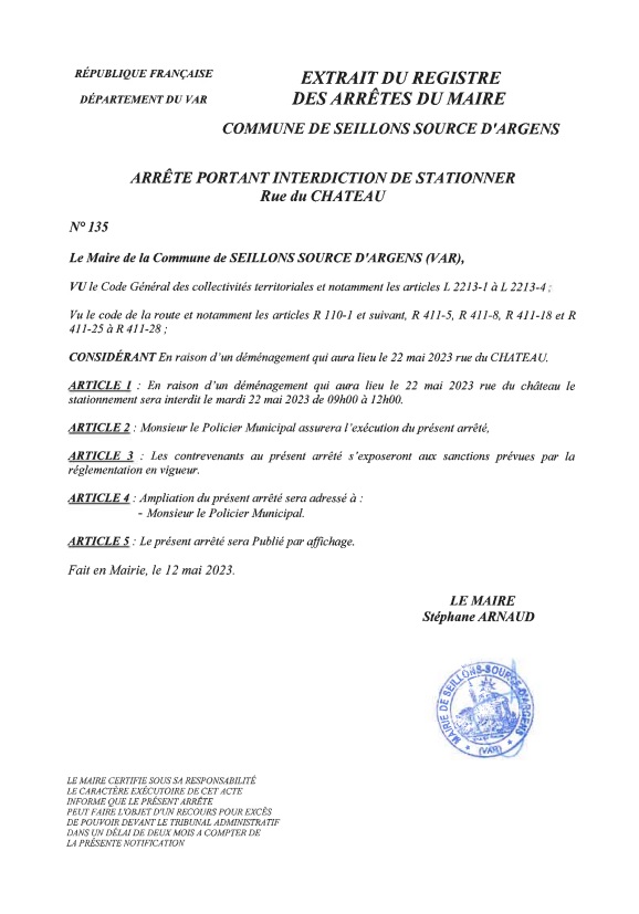 Arrêté n°135 : En raison d’un déménagement le :