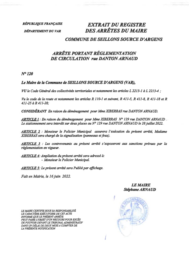 « Arrêté n°120 : En raison d’un déménagement pour le compte d’un particulier le :