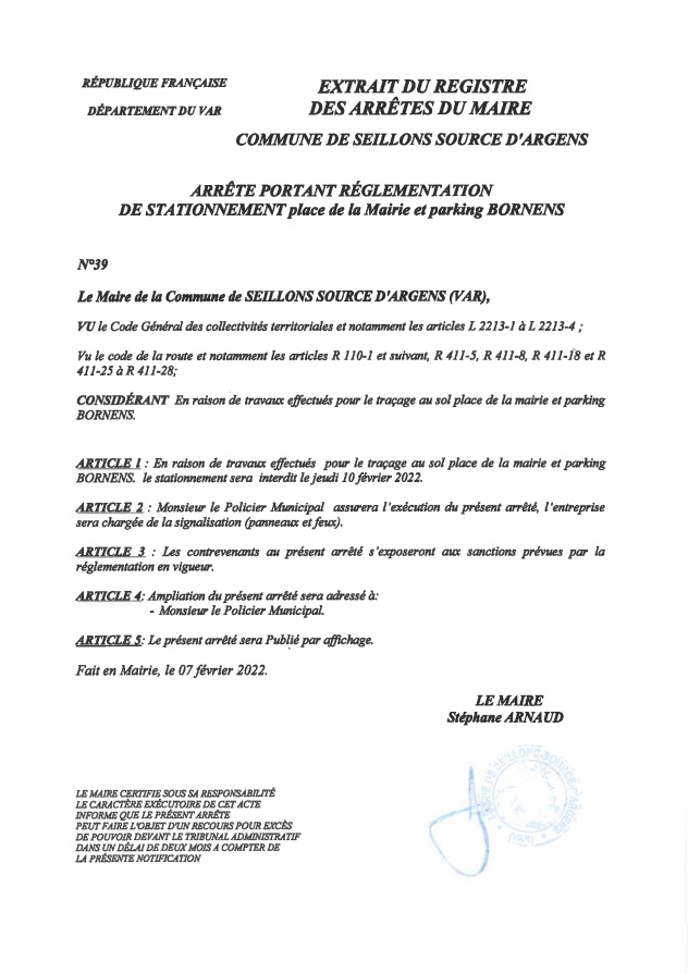 « Arrêté n°39 : En raison de travaux de traçage au sol, le: