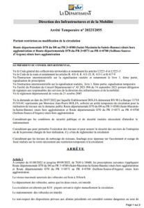 … 01/08/2022 et jusqu’au 09/09/2022, de 7h30 à 18h00, la circulation des véhicules est réglementée sur la route Départementale rd 70 en et hors agglomération :
