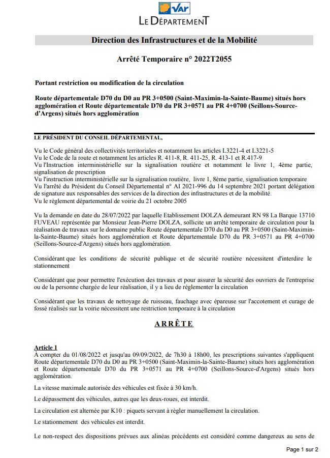 «Pour permettre l’exécution des travaux et pour assurer la sécurité des ouvriers de l’Etablissement DOLZA sur la route départementale RD 70 hors agglomération.