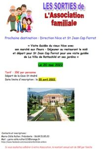 L’association familiale vous invite à deux visites guidées du vieux Nice avec son marché aux fleurs et de la villa et jardins de Béatrice Ephrussi Rothschild à Saint Jean Cap Ferrat.