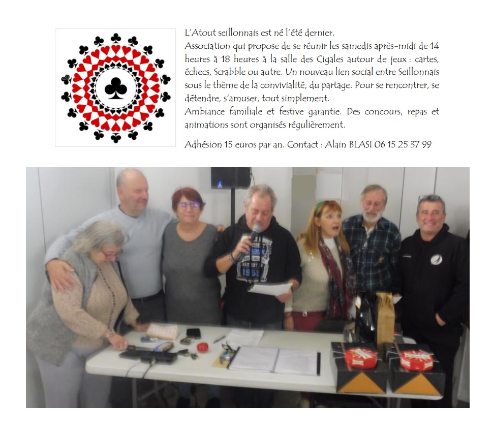 Les membres du bureau de l’association l’Atout Seillonnais souhaitent vous faire découvrir leur jeune association et vous attendent nombreux pour partager un moment chaleureux de jeu :