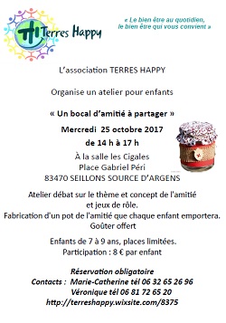 Comme à chaque vacances, l’association Terres Happy organise un atelier ludique. Pour les vacances d’octobre, cet atelier s’adresse aux enfants de 7 à 9 ans.