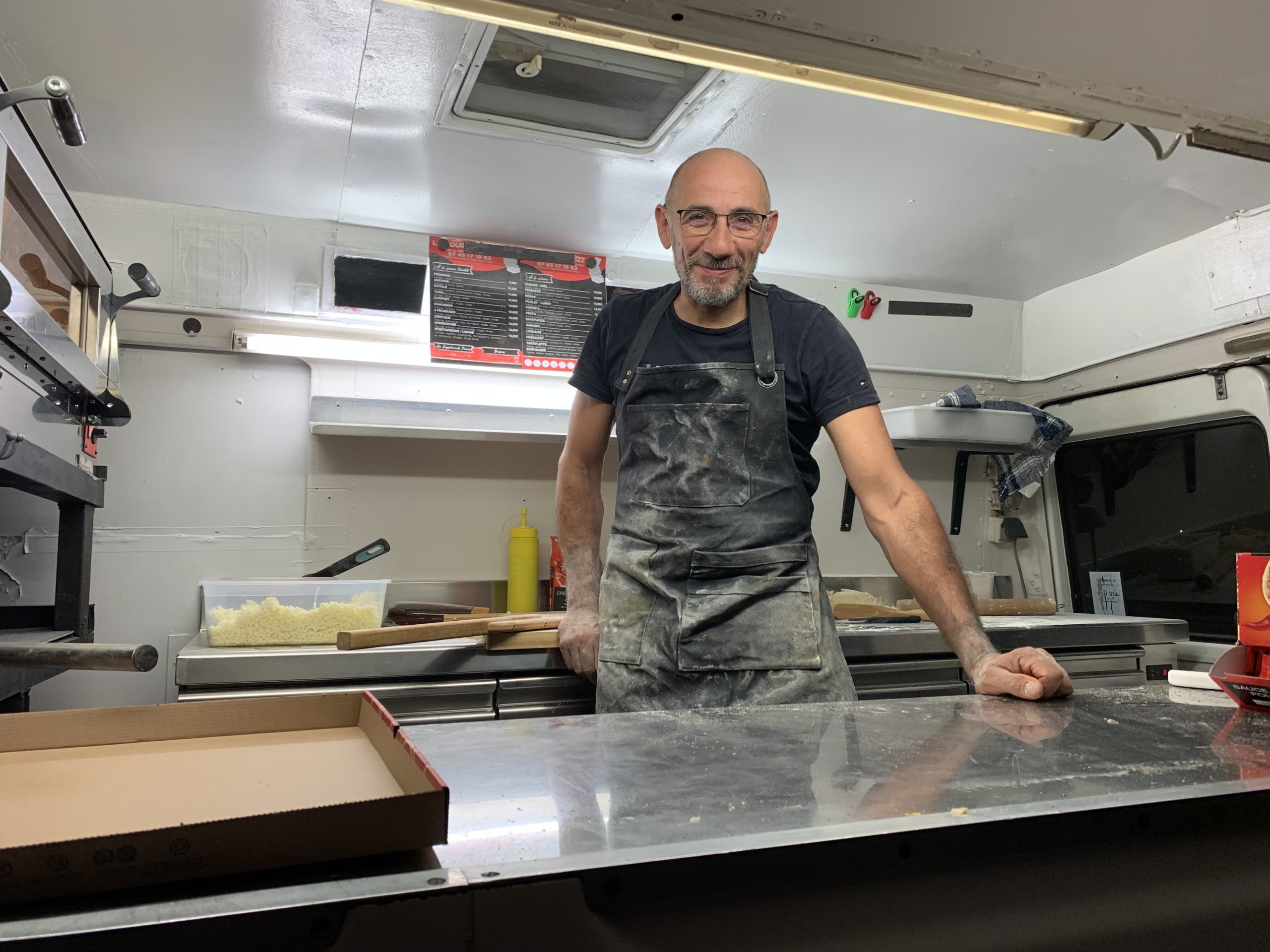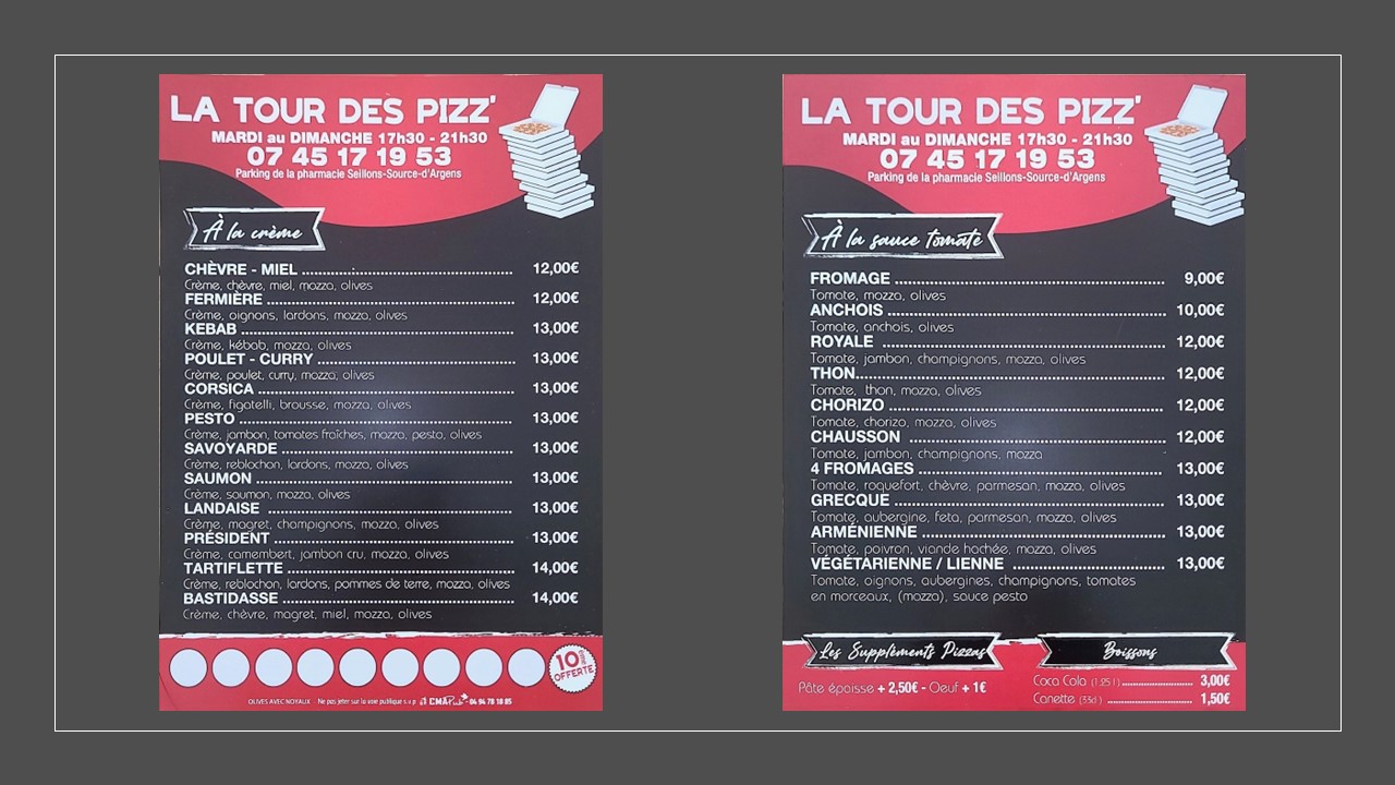 Il précise que suivant les demandes il peut proposer deux garnitures différentes pour une même pizza (une pizza moite-moite) et il propose une carte de fidélité.