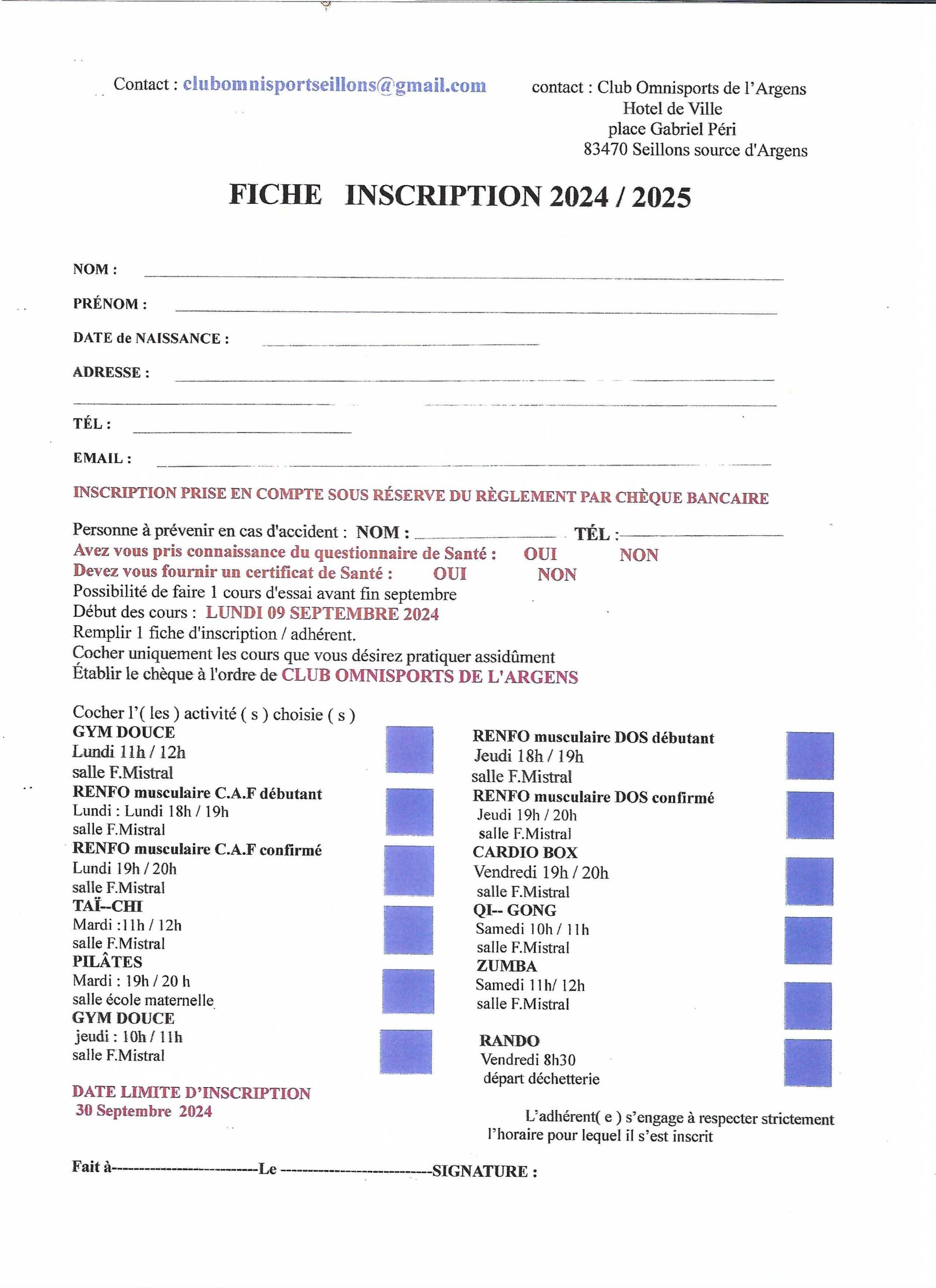 - un chèque libellé à l’ordre du Club Omnisports