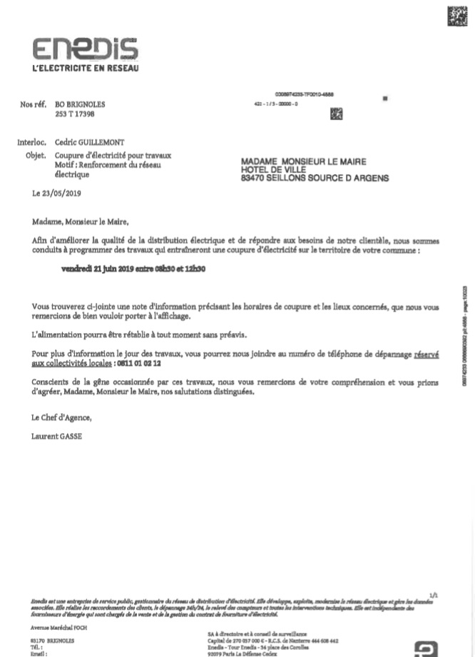 « Afin d’améliorer la qualité de la distribution électrique et de répondre aux besoins de notre clientèle, nous sommes conduits à programmer des travaux qui entraîneront une coupure d’électricité sur le territoire de votre commune: