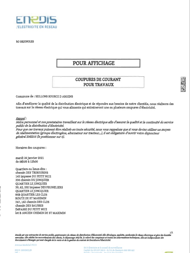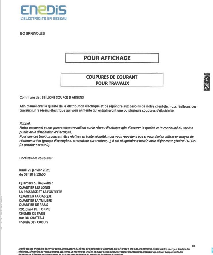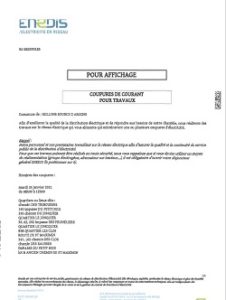 » Afin d’améliorer la qualité de la distribution électrique et de répondre aux besoins de notre clientèle, nous sommes conduits à programmer des travaux qui entraîneront une coupure d’électricité le: