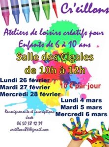 Alors n’hésitez plus et réservez dès à présent votre atelier au 06 50 38 12 39 ou creillons83@gmail.com