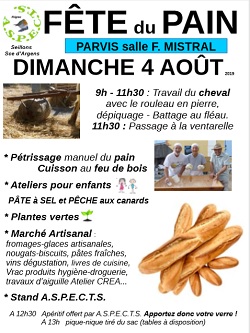 L’association ASPECTS vous invite à la fête du pain dimanche 4 Août à partir de 9h00, Parvis Salle Frédéric Mistral.