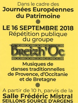 L’association Breizh’Oc (Association culturelle pour l’étude, la connaissance et le développement des musiques et danses traditionnelles des cultures de Bretagne et de Provence) vous invite, dans le cadre des journées du patrimoine :