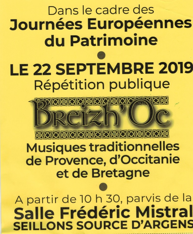 Dans le cadre des journées Européennes du patrimoine, l’association Breizh’Oc (Association culturelle pour l’étude, la connaissance et le développement des musiques et danses traditionnelles des cultures de Bretagne et de Provence) vous invite: