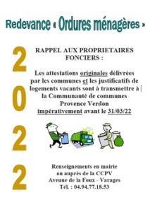 Service redevance ordures ménagères de la CCPV ( Avenue de la Foux – Varages) par téléphone au : 04 94 77 18 53