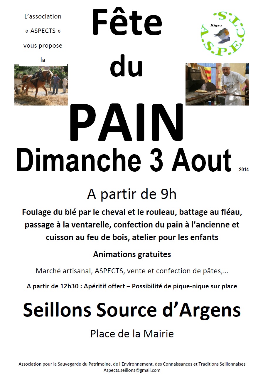 Un mois après la fête de la moisson, il est temps de travailler le blé ramassé. L’association ASPECTS vous invite donc place de la mairie dimanche 3 Août à partir de 9h00. Le blé y sera foulé, battu et tamisé pour donner la farine. Sous les doigts experts du boulanger, elle donnera le pain à l’ancienne qui sera cuit au feu de bois.