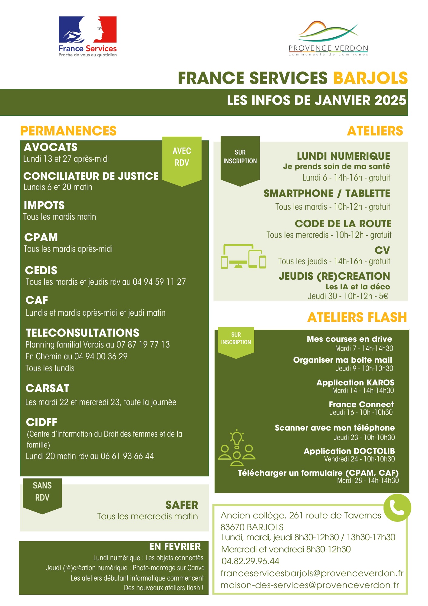 France Services Barjols vous informe des activités et permanences prévues pour ce premier mois de l’année 2025 :