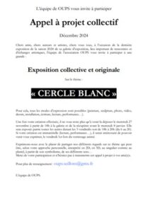 « Chers amis, auteurs, artistes et créateurs, à l’occasion de la dernière exposition de la saison 2024, la galerie OupS, lieu de rencontres et d’échanges artistiques, vous invite à participer à une exposition collective sur le thème : « Cercle blanc ».