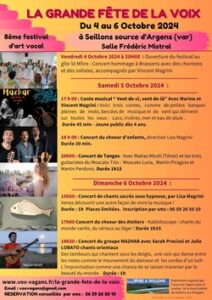 - Samedi 5 octobre : salle Frédéric Mistral à Seillons