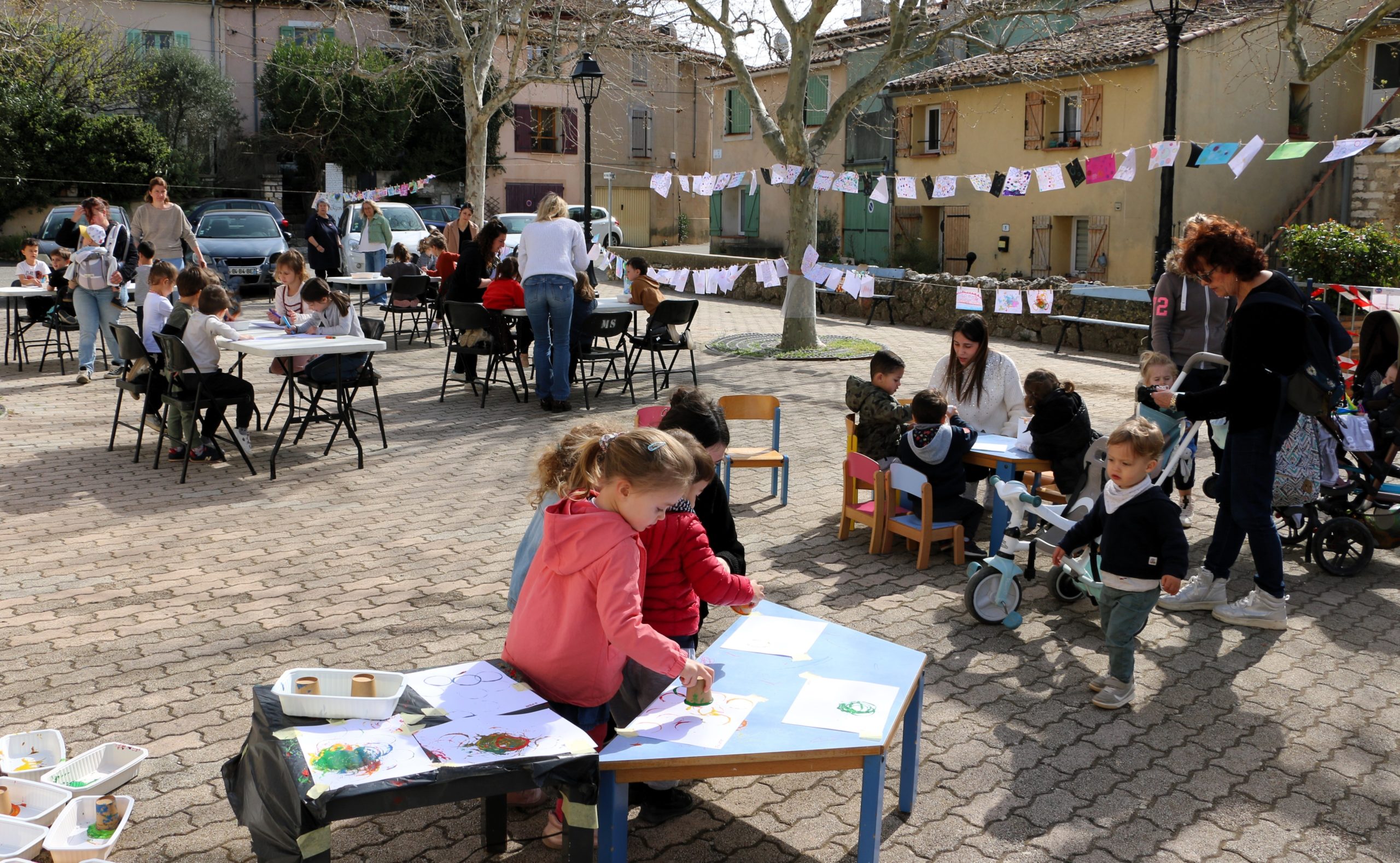 Les enfants de différents âges se sont donc retrouvés place de la mairie pour afficher leurs réalisations qui ont égayé la place et ensemble découvrir les installations de leurs copains et participer à des activités manuelles. Les poissons dans leur bocal ont particulièrement attiré ce jeune public mais aussi les tables d’activité disposées et les bulles de savon des enfants de la crèche.
