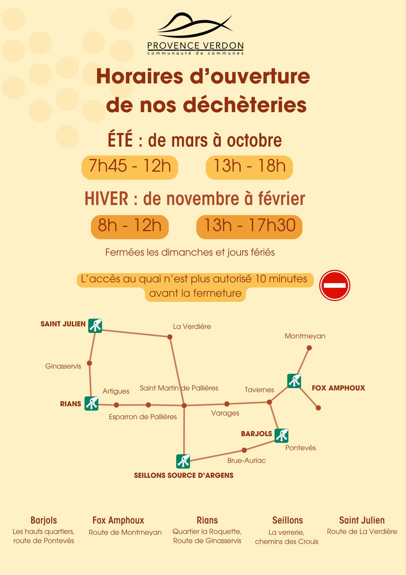 « Les déchèteries du territoire sont passées aux horaires d’été à compter du 01 mars, jusqu’à octobre 2025 :