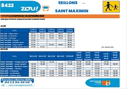 écoletransports scolaires Horaires ZOU 2023/2024 by LeSeillonnais 31aoû écrit par LeSeillonnais 31aoû 16 Les transports ZOU vous informent: « A compter du 04 septembre 2023, les horaires pour la ligne 8422, aller-retour Seillons/Saint-Maximin-la-sainte-Baume, ne fonctionnant qu’en période scolaire sont les suivants : Cliquer sur le lien ICI. » Bonne rentrée à tous ! 83470mairiemairie seillonsmairie seillons sourceSaint Maximinseillonsseillons sourceseillons source d'argenstransport scolairetransports scolairesvarvivre a seillonsvivreaseillonsZouzou transport 0 commentaires 0 FacebookTwitterPinterestEmail LeSeillonnais article précédent Arrêté communal n° 211 article suivant Club omnisports : rentrée 2023/2024! You may also like La Grande Lessive : une journée haute en... 23mar Menu cantine scolaire avril 2025 19mar Réussir ton brevet 11mar Une belle initiative ! 27fév Un Après-Midi Magique pour les Enfants : Noël... 26nov Marché de Noël : un moment de fête... 20nov Bilan de l’opération sapin de Noël 2024 au... 19nov Transport scolaire : remboursement 1oct Vente de sapins de Noël au profit des... 24sep Salon de l’alternance et de la formation 17sep Leave a Comment Cancel Reply Save my name, email, and website in this browser for the next time I comment. Δ