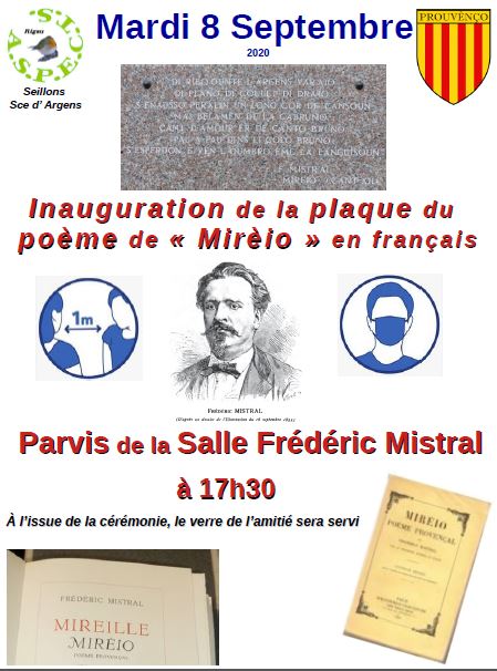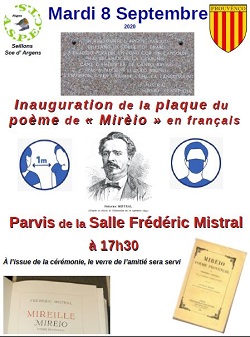 … inaugurer une plaque sur laquelle est écrit en français un passage de « Mirèio », à côté de celle où le même texte en provençal y est déjà.